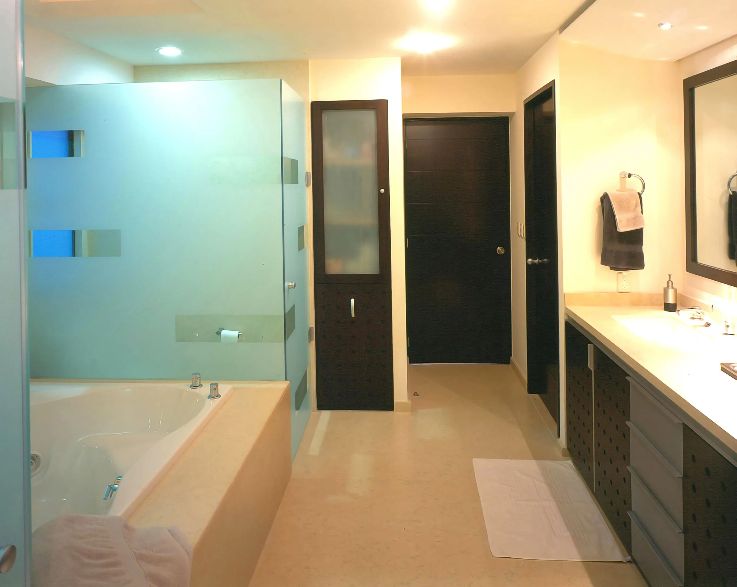 The toilet functions as a backup to the access hall, and creates a circulation corridor at the back so that we do not have to access the dining room area if one wishes to go to the kitchen. This hallway has two visual finishes at both ends and a lambrin was designed based on wood, ceramic glass and aluminum that integrates part of the lighting through flying buttresses that emerge from the wooden panels. Light becomes very important, the lighting controls are automated, and different scenes can be created in the apartment, and during the day the apartment is bathed in natural light throughout the large window in the living-dining room that takes advantage of spectacular views of the Club de Golf.